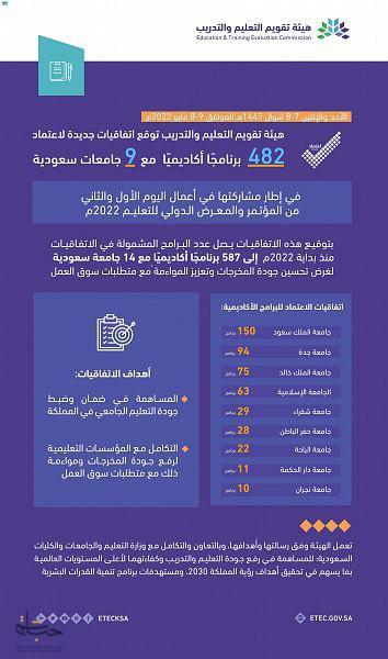 وشملت الاتفاقيات اعتماد “150” برنامجًا أكاديميًّا لجامعة الملك سعود و”94″ برنامجًا أكاديميًّا لجامعة جدة و”75″ برنامجًا لجامعة الملك خالد و”63″ برنامجًا للجامعة الإسلامية و”29″ برنامجًا لجامعة شقراء، و”28″ برنامجًا لجامعة حفر الباطن، واعتماد “22” برنامجًا لجامعة الباحة و”11″ برنامجًا لجامعة دار الحكمة و”10″ برامج لجامعة نجران.