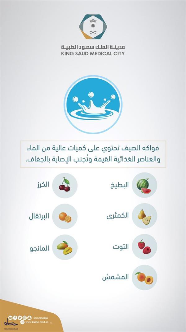 نصحت مدينة الملك سعود الطبية، باختيار وتناول الفواكه التي تحتوي على كميات عالية من الماء والعناصر الغذائية القيمة خاصة خلال فصل الصيف.