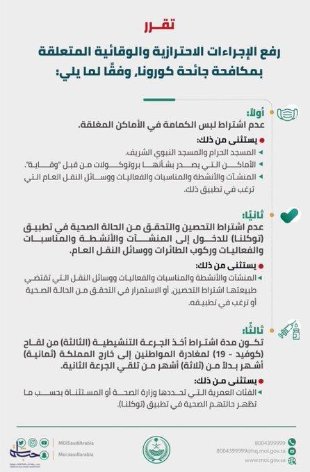 أولاً: عدم اشتراط لبس الكمامة في الأماكن المغلقة، باستثناء المسجد الحرام، والمسجد النبـوي الشـريف، والأماكن الـتـي يصـدر بشـأنها بروتوكولات مـن قبـل هيئة الصحة العامـة “وقايـة”، أو المنشـآت والأنشطة والمناسبات والفعاليـات ووسائل النقـل العـام الـتي ترغب في تطبيق مستويات حمايـة أعلـى مـن خـلال الاستمرار باشتراط لـبس الكمامـة للـدخول إليهـا، مع الاستمرار بالتوعية والحث على استخدامها.