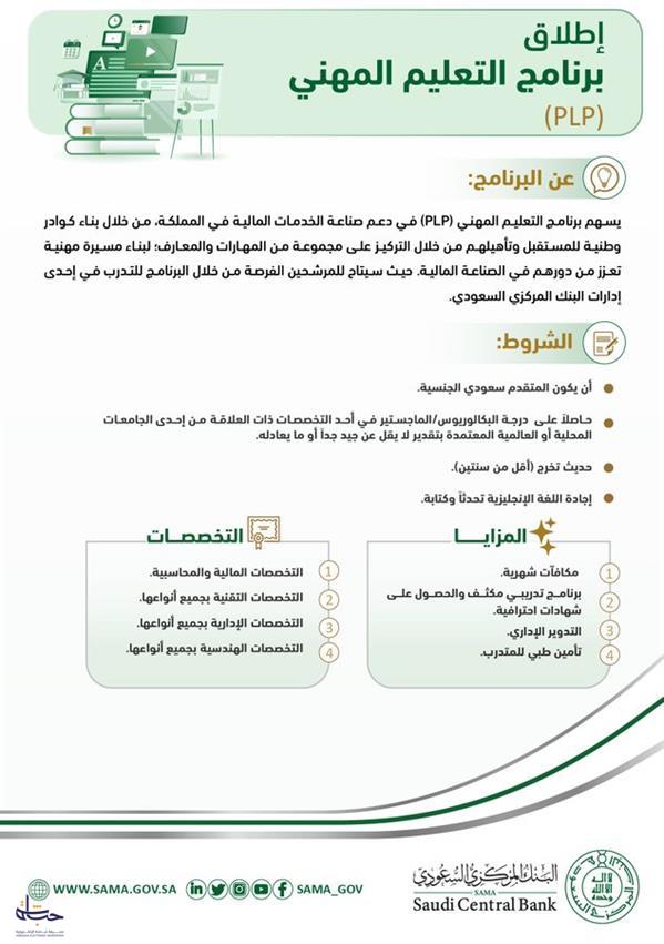 أعلن البنك المركزي فتح باب التقدم لبرنامج التعليم المهني؛ لمدة أسبوعين، اعتبارًا من اليوم (الخميس) وحتى الأول من أكتوبر المقبل، للحاصلين على البكالوريوس أو الماجستير في أحد التخصصات ذات العلاقة بهدف إكساب المتدربين المهارات اللازمة، وتأهيلهم لمواكبة مستجدات صناعة الخدمات المالية في المملكة.