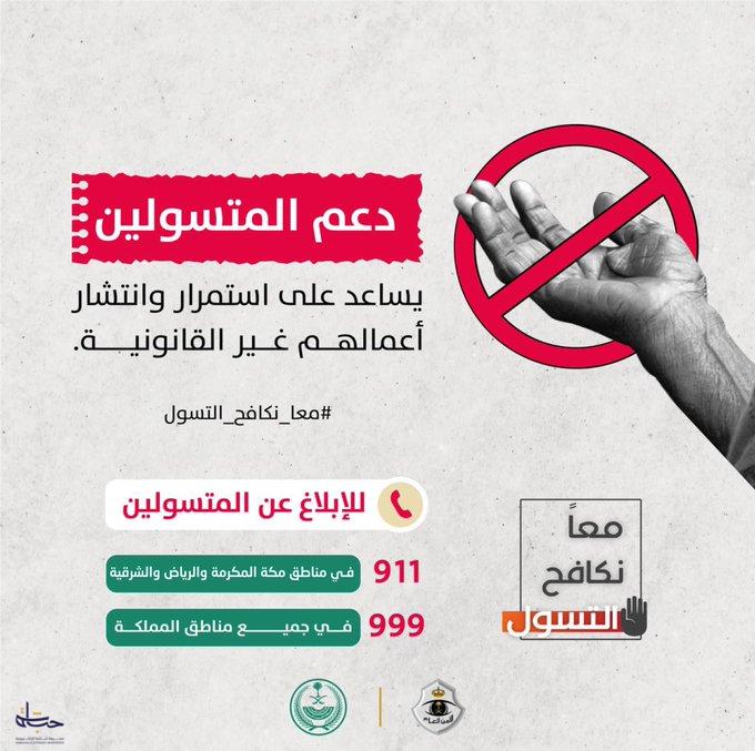 وقال الأمن العام: “لا تعطهم .. دعم المتسولين يساعد على استمرار وانتشار أعمالهم غير القانونية”. وحثّ الأمن العام على الإبلاغ عن المتسولين عبر الرقم 911 في مناطق مكة المكرمة والرياض والشرقية، و999 في جميع مناطق المملكة.