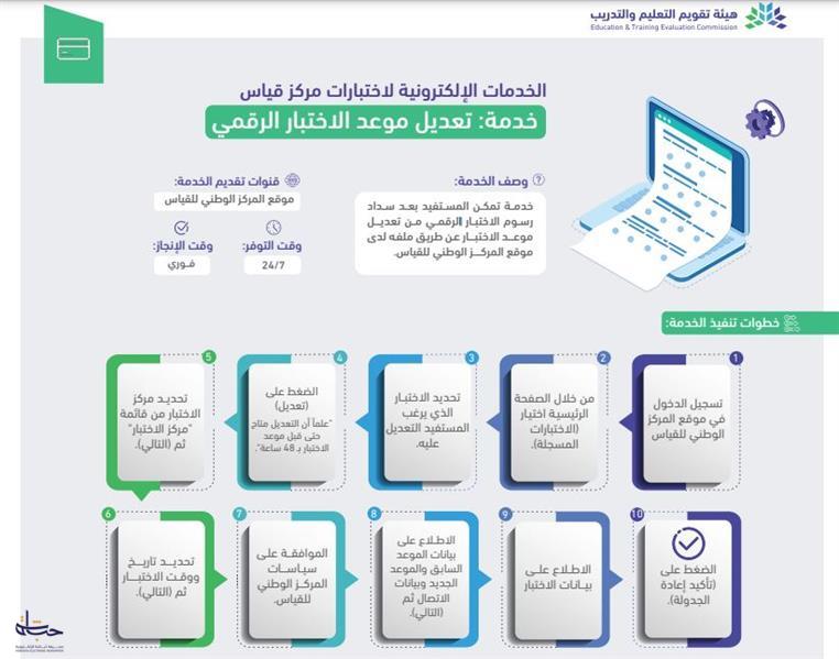 وأشارت إلى أن خدمة تعديل موعد الاختبار الرقمي، هي خدمة تمكن المستفيد بعد سداد رسوم الاختبار الرقمي من تعديل موعد الاختبار عن طريق ملفه لدى موقع المركز الوطني للقياس.