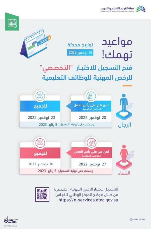 أعلنت هيئة تقويم التعليم والتدريب، موعد فتح التسجيل في الاختبار التخصصي لرخصة الوظائف التعليمية.