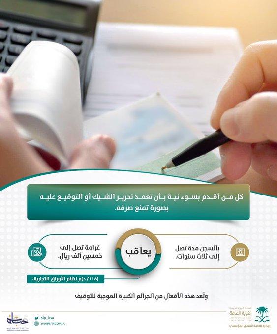 وقالت النيابة العامة عبر حسابها الرسمي على “تويتر”: “كل من أقدم بسوء نيّة بأن تعمّد تحرير الشيك أو التوقيع عليه بصورة تمنع صرفه؛ يعاقب بالسجن مدة تصل إلى ثلاث سنوات، وبغرامة تصل إلى خمسين ألف ريال”، مشددة على أنها من الجرائم الكبيرة الموجبة للتوقيف.