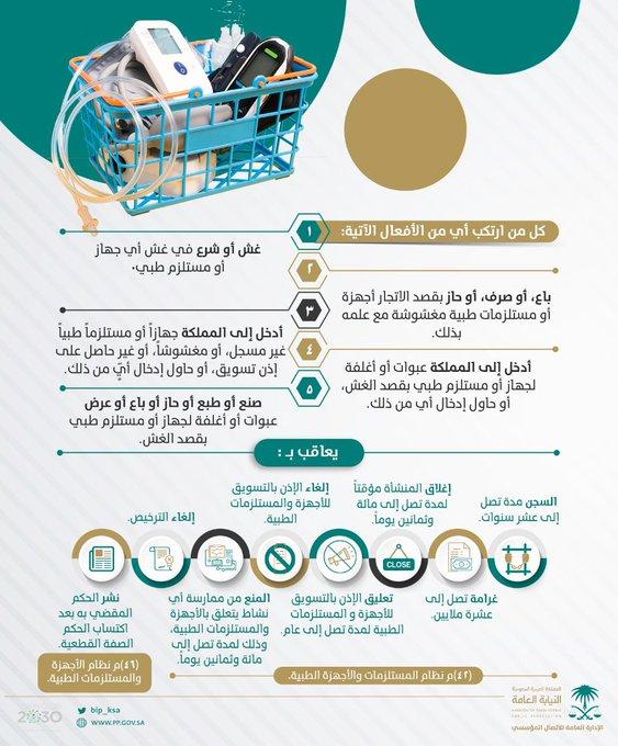 كما تتضمن العقوبات “إلغاء الترخيص، وغرامة تصل إلى عشرة ملايين ريال، وتعليق الإذن بالتسويق للأجهزة والمستلزمات الطبية لمدة تصل إلى عام، والمنع من ممارسة أي نشاط يتعلق بالأجهزة والمستلزمات الطبية وذلك لمدة – تصل إلى مائة وثمانين يوما، ونشر الحكم المقضي به بعد اكتساب الحكم الصفة القطعية”، بحسب بيان النيابة العامة.