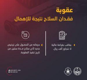 وأوضح “الأمن العام” عبر حسابه الرسمي بموقع “تويتر” أنه يعاقب بغرامة مالية لا تتجاوز ألف ريال، إضافة إلى حرمانه من الحصول على ترخيص جديد لأي سلاح مدة سنتين من الأمن العام تاريخ تنفيذ العقوبة.