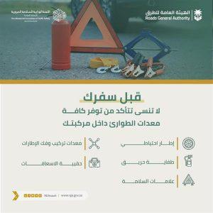 دعت الهيئة العامة للطرق، إلى ضرورة التأكد من توفر معدات الطوارئ داخل المركبة قبل السفر.