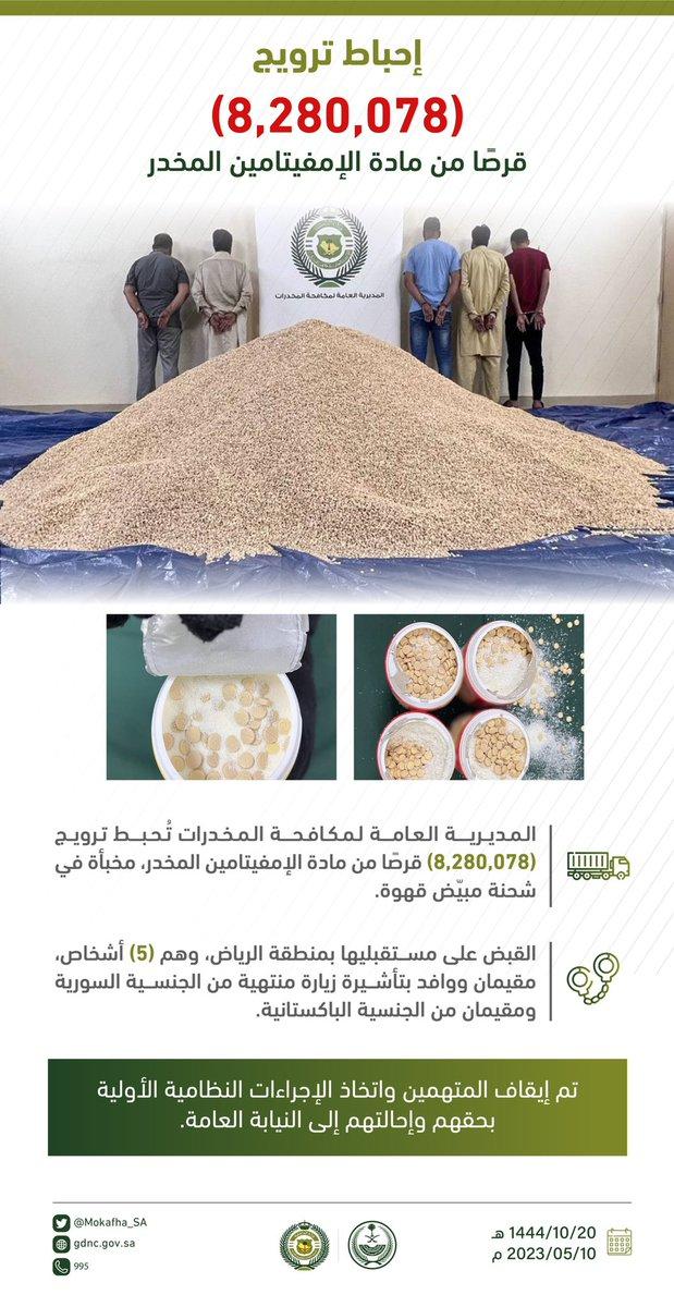 صرح المتحدث الرسمي للمديرية العامة لمكافحة المخدرات الرائد مروان الحازمي، أن المتابعة الأمنية لشبكات تهريب وترويج المخدرات التي تستهدف أمن المملكة وشبابها، أسفرت عن ضبط (8,280,078) قرصًا من مادة الإمفيتامين المخدر مخبأة في شحنة مبيّض قهوة، والقبض على مستقبليها بمنطقة الرياض، وهم (5) أشخاص، مقيمان ووافد بتأشيرة زيارة منتهية من الجنسية السورية ومقيمان من الجنسية الباكستانية، وجرى إيقاف المتهمين واتخاذ الإجراءات النظامية الأولية بحقهم وإحالتهم إلى النيابة العامة.