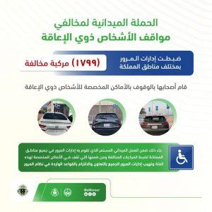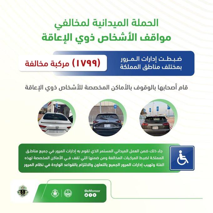 ضبطت إدارات المرور بمختلف مناطق المملكة، 1799 مركبة مخالفة، قام أصحابها بالوقوف في الأماكن المخصصة للأشخاص ذوي الإعاقة.