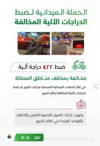 ضبطت إدارات المرور بمختلف مناطق المملكة، 422 دراجة آلية مخالفة.