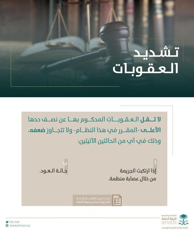 وقالت النيابة العامة: “لا تقل العقوبات المحكوم بها عن نصف حدها الأعلى -المقرر في هذا النظام- ولا تتجاوز ضعفه، وذلك في حالة إذا ارتكبت الجريمة من خلال عصابة منظمة، أو في حالة العود”.