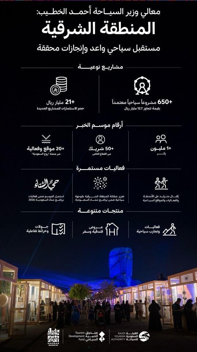 وكان معالي وزير السياحة ورئيس مجلس إدارة الهيئة السعودية للسياحة الأستاذ أحمد بن عقيل الخطيب؛ زار المنطقة الشرقية واجتمع مع صاحب السمو الملكي الأمير سعود بن نايف بن عبدالعزيز، أمير المنطقة الشرقية، وبحثا معاً تعزيز الجهود من أجل تطوير القطاع السياحي بالمنطقة، إضافة لتمكين الكوادر الوطنية في وظائف القطاع السياحي بالمنطقة.