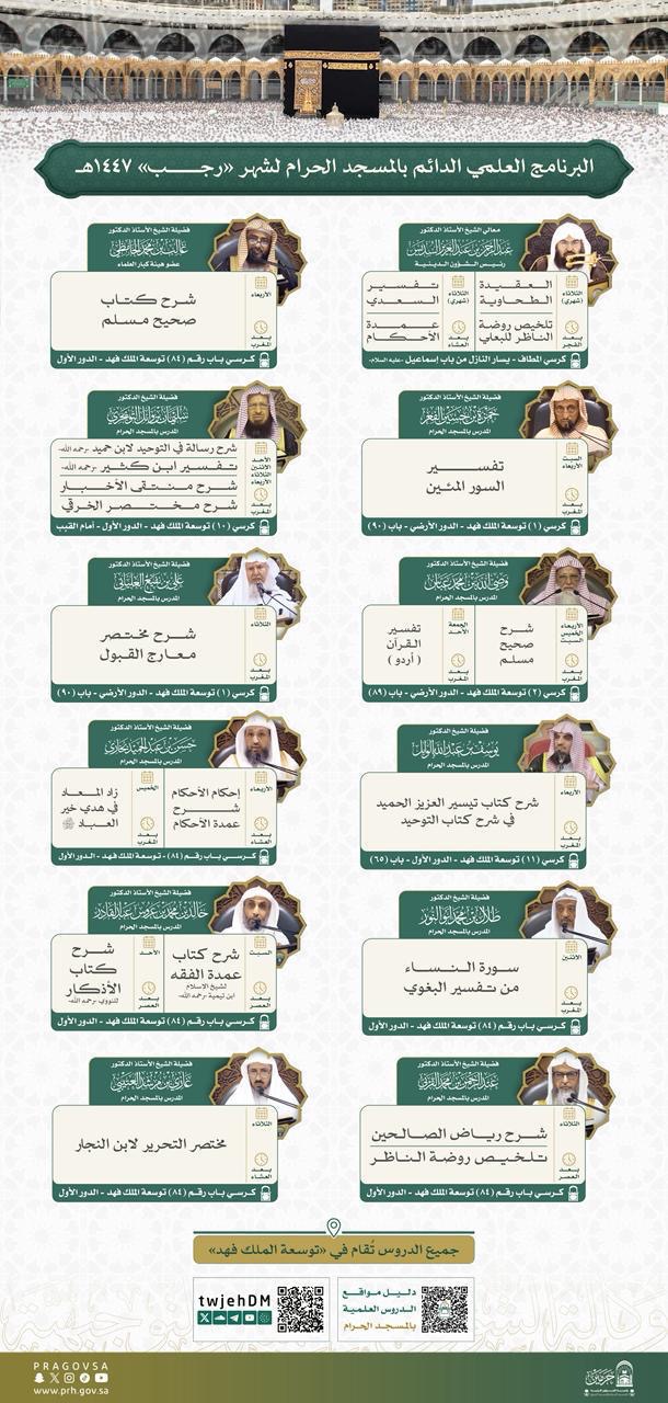 أصدرت رئاسة الشؤون الدينيّة بالمسجد الحرام والمسجد النبوي جدول البرنامج العلمي الدائم بالمسجد الحرام لشهر رجب 1447هـ.