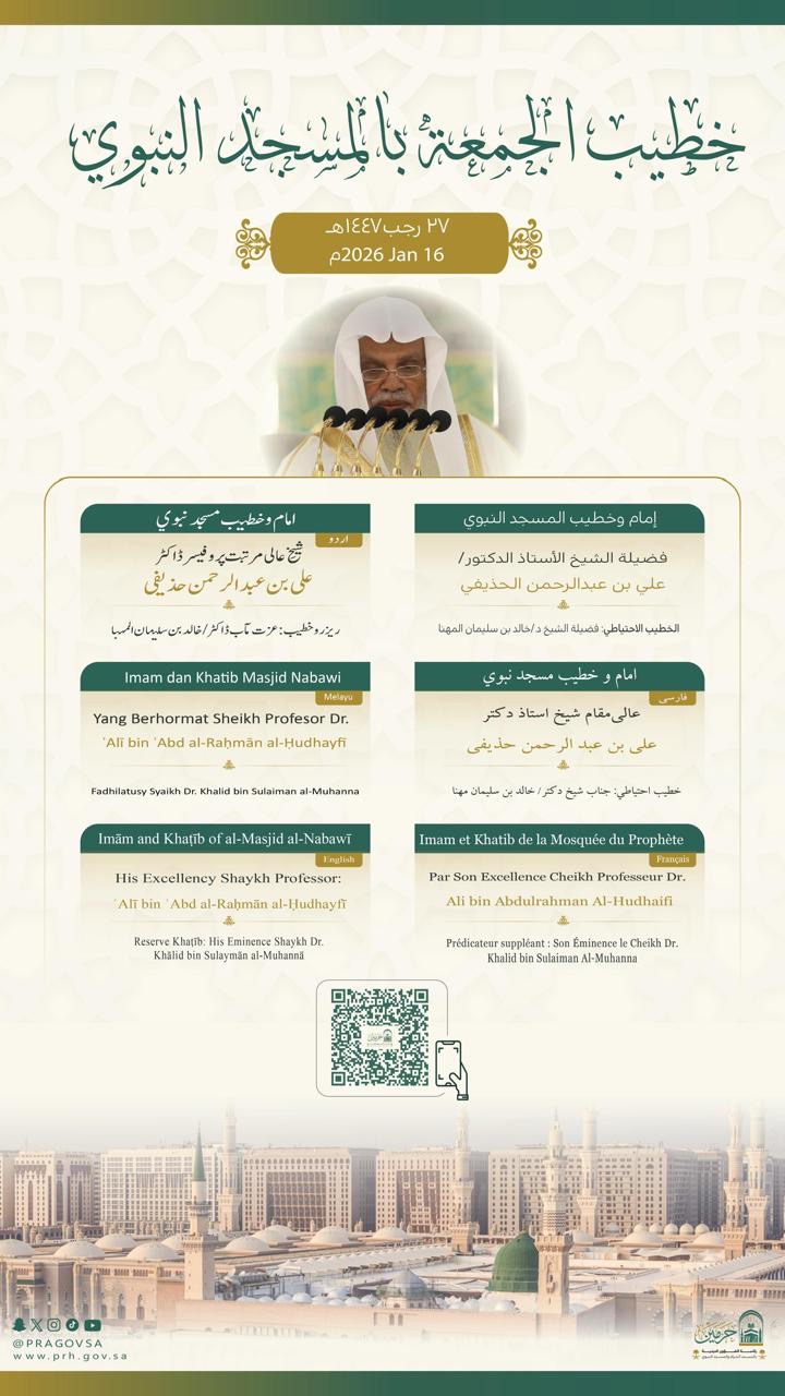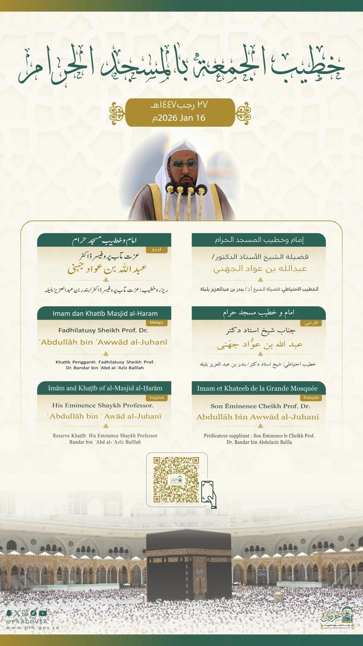 أوضحت رئاسة الشؤون الدينيّة بالمسجد الحرام والمسجد النبوي، أسماء خطيبا وإماما صلاة الجمعة في الحرمين الشريفين 27 رجب 1447هـ وذلك ضمن جدولها الدوري لتنظيم الإمامة والخطابة.