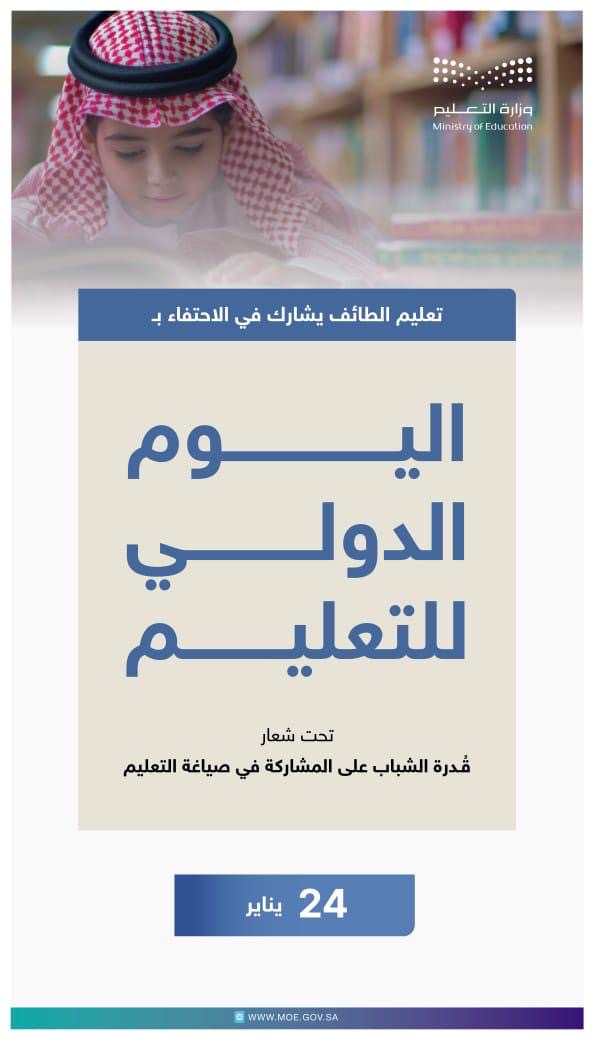 تشارك الإدارة العامة للتعليم بمحافظة الطائف في الاحتفاء باليوم الدولي للتعليم 2026 ، تحت شعار ” قدرة الشباب على المشاركة في صياغة التعليم والذي يوافق 24 يناير من كل عام عرفانًا بمكانته الكبيرة في تقدم الشعوب ونهضة الأمم، وتقديرًا للمدرسة ومكوناتها البشريّة ومخرجاتها النوعيّة .